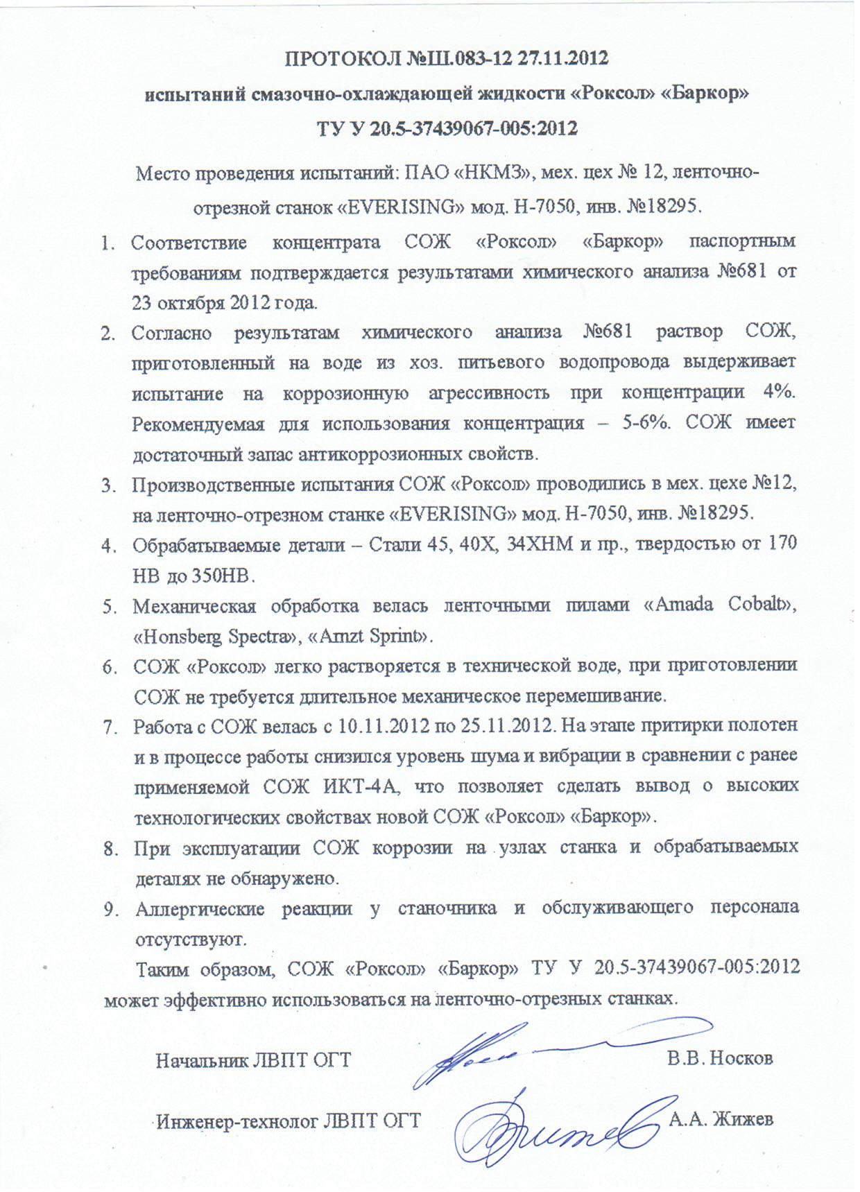 випробувань мастильно-охолоджувальної рідини "РОКСОЛ" ТУ У 20.5-37439067-005: 2010