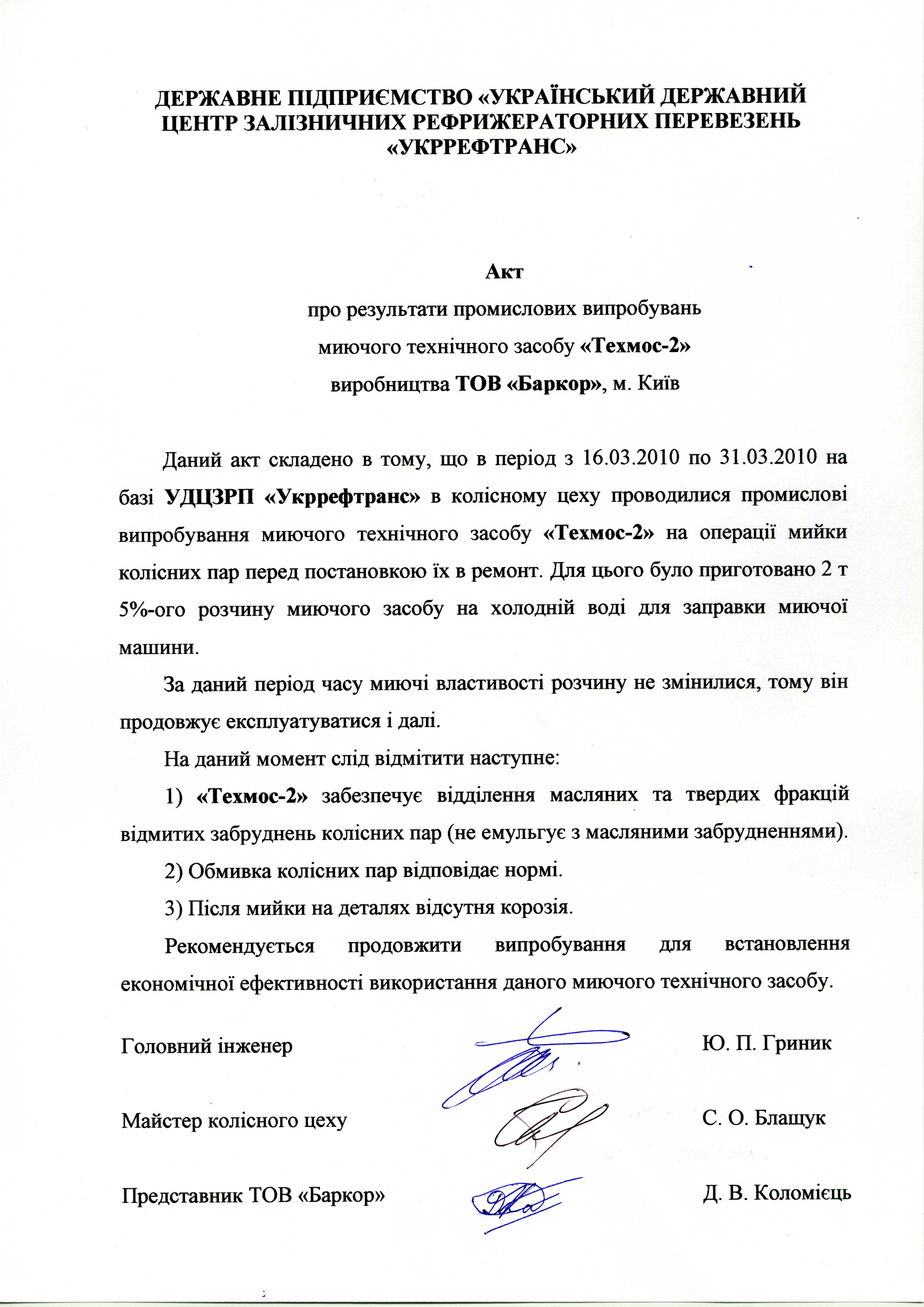 про результати промислових випробуванб миючого технычного засобу "Техмос-2"